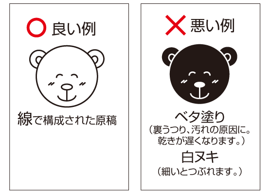 ・色ベタやベタの白抜き文字などは、文字が潰れたり裏写りの原因になります。