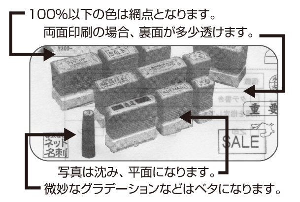 ・両面印刷、多色印刷は、汚れ、かすれ、裏写り(表面の汚れ)が通常よりも生じます。