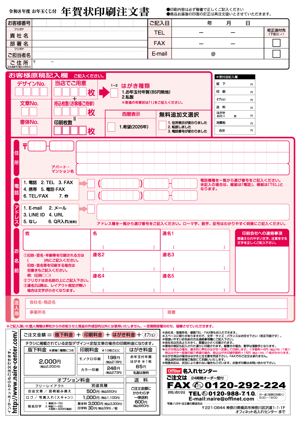 | 宛名印字 | 基本料 ¥3,000 (税込¥3,300) 印刷料 ¥30 (税込¥33)/枚 |